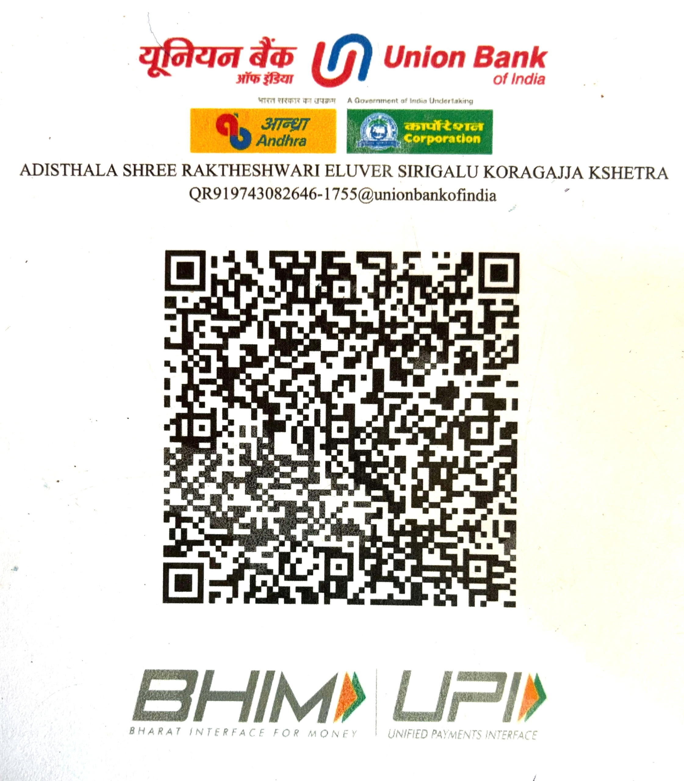 QR Code Bank Details Name: ADISTHALA SHREE RAKTHESHWARI ELUVER SIRIGALU KORAGAJJA KSHETHRAAccount No. : 520101257411755IFSC code: UBIN0907324Branch: JeppuBank: Union Bank of India